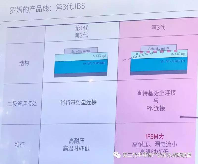 SiC肖特基工藝的改進(jìn)?,F在市面上的SiC肖特基產(chǎn)品有兩種構造,一種是純肖特基構造。羅姆的第一代和第二代產(chǎn)品采用了純肖特基的構造。純肖特基構造的最大好處在哪里?因為肖特基有兩個(gè)特性,一個(gè)是VF,即正向耐壓;另一個(gè)特性是瞬間的最大電流。所以如果用肖特基構造來(lái)做,雖然VF可以做得很低,但是瞬間電流做得不好。