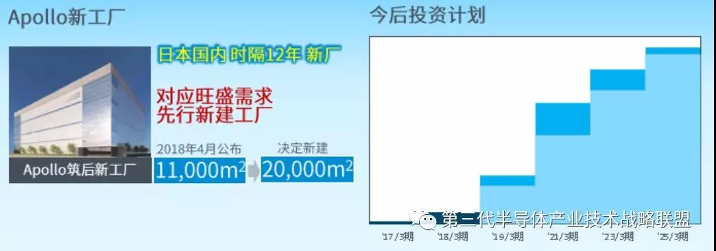 SiC作為新一代技術(shù)和產(chǎn)品,需要擴建和持續投資。例如羅姆,需要多個(gè)階段性投資,預計到2025年時(shí)將,累計投資將達850億日元(如下圖右)。